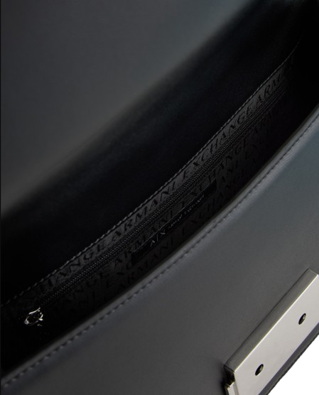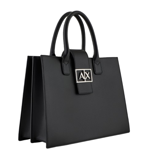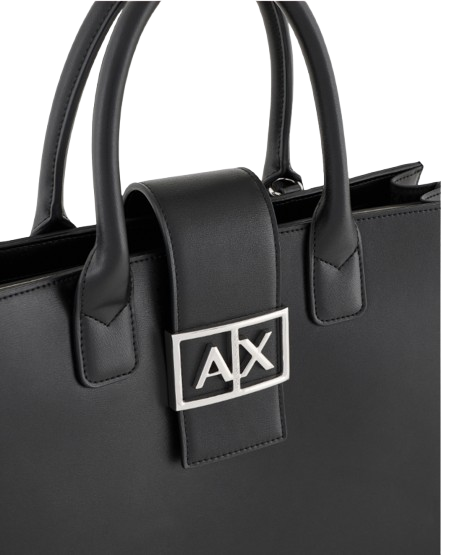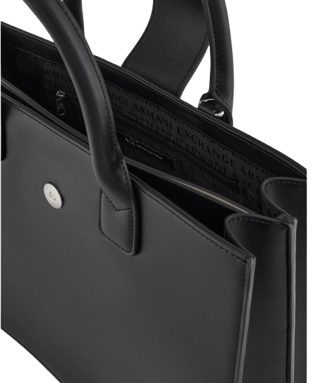 Borsa donna Armani Exchange. Modello: borsa a mano a trapezio, con logo decorativo, chiusura ad incastro, due manici, tasca interna e con tracolla removibile. Dimensioni: altezza 23cm, larghezza 14cm, lunghezza 34cm. Composizione: ecopelle. Colore: nero.