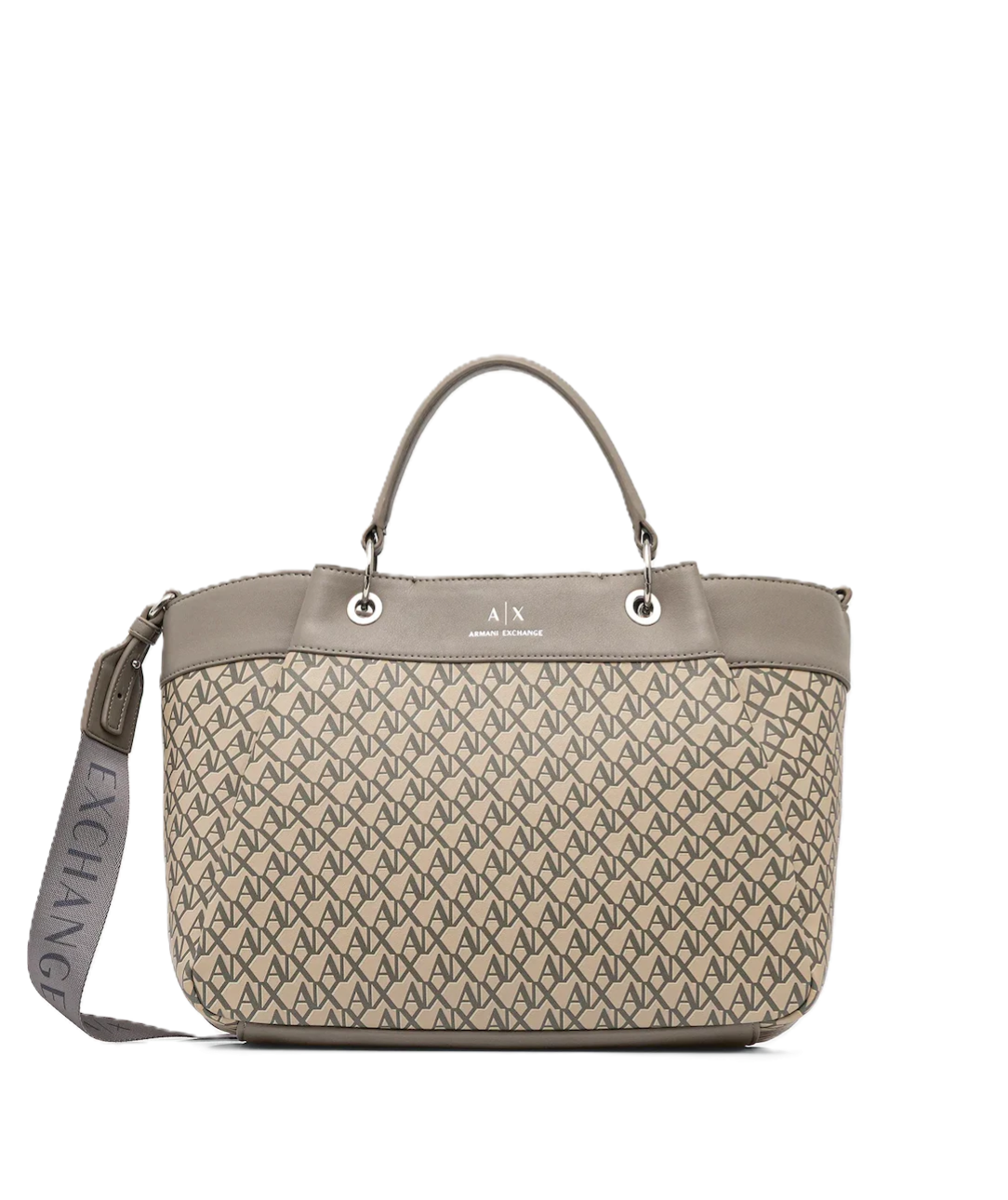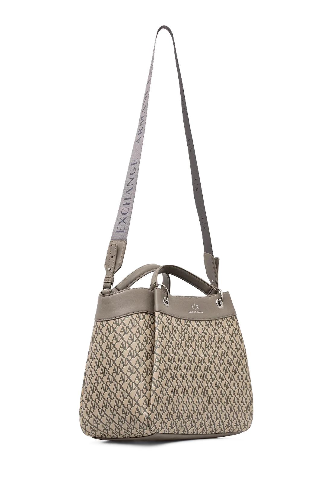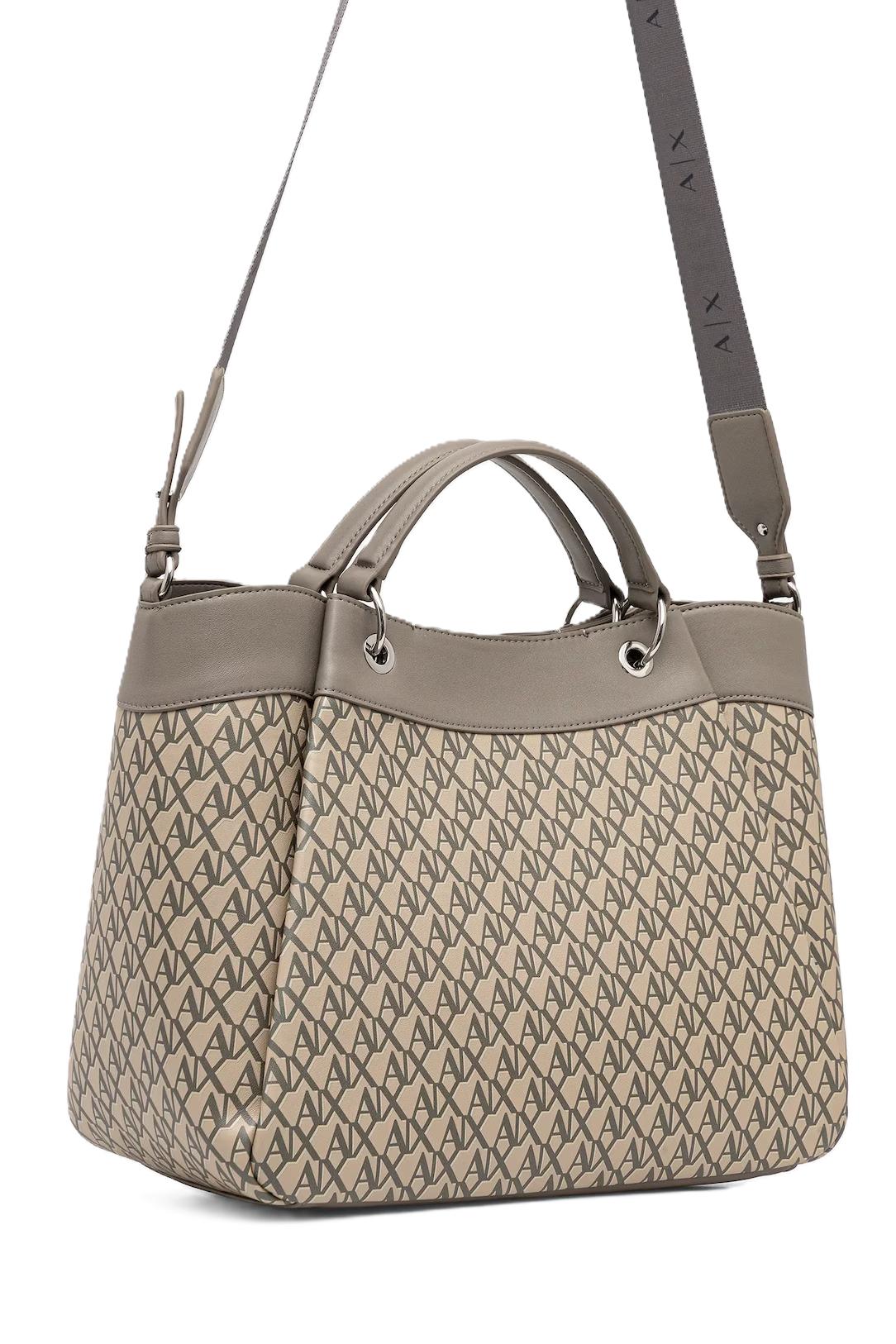 Borsa donna Armani Exchange. Modello: borsa grande, con tracolla regolabile e removibile, chiusura magnetica. Dimensioni: lunghezza della tracolla minima/massima 105/117 cm, larghezza alla base 33cm, altezza 27,5 cm, profondità 15cm. Composizione: 100% poliestere. Colore: beige