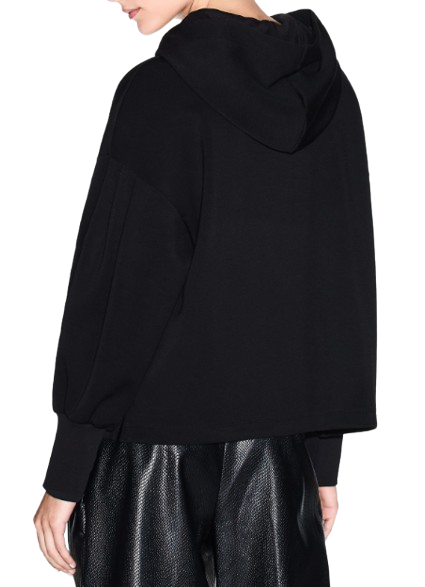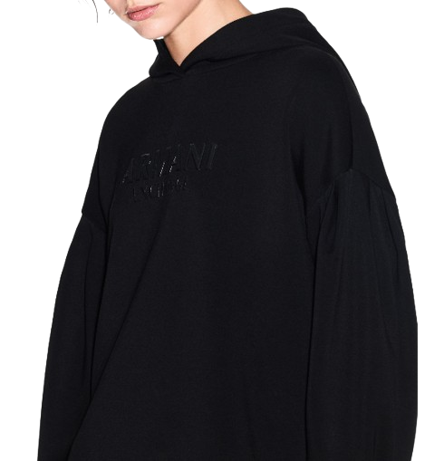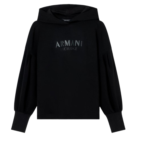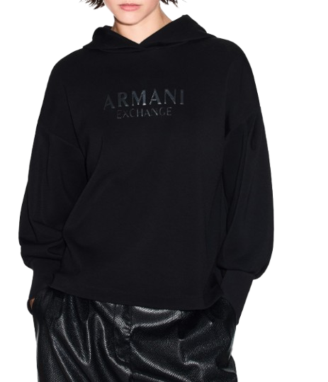 Felpa donna Armani Exchange. Modello: felpa a maniche lunghe, con cappuccio e logo a contrasto. Composizione: 56% poliammide, 8% elastane, 36% viscosa. Colore: nero.