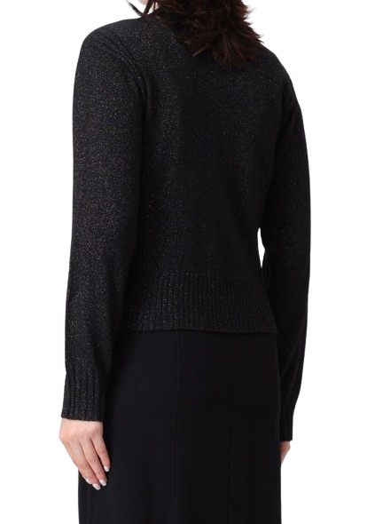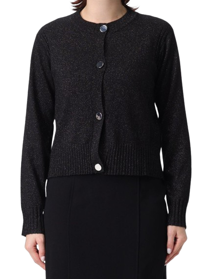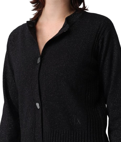Maglia donna Armani Exchange. Modello: cardigan girocollo con chiusura a bottoni e bordi a costine. Composizione: 27% viscosa, 27% lana vergine,36% poliammide. Colore: nero.