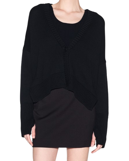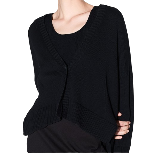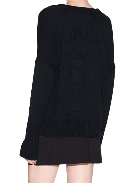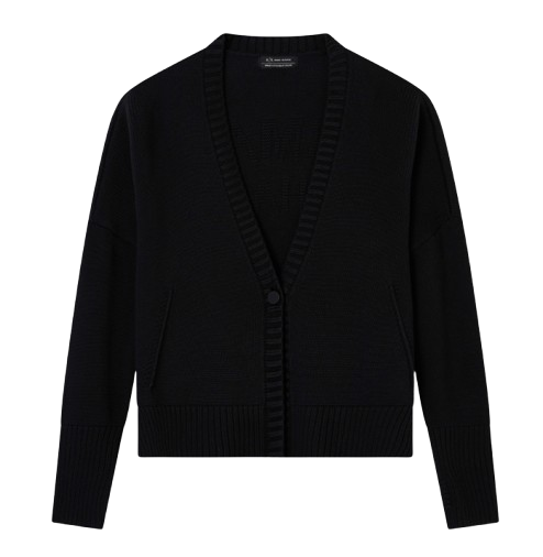 Maglia donna Armani Exchange. Modello: maglia maniche lunghe con spalla scesa, scollo a V profondo, chiusura frontale con bottone, polsini e fondo a costine, due tasche laterali. Composizione: 100% cotone. Colore: nero.