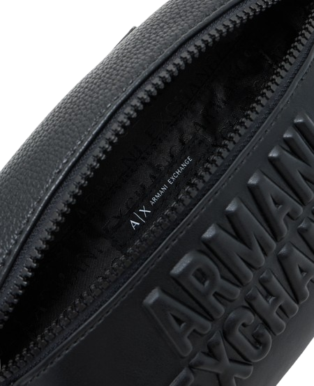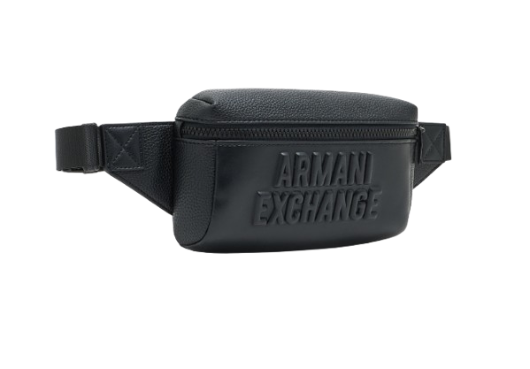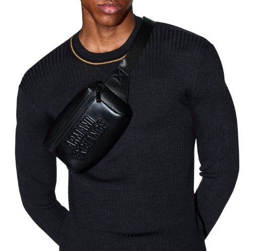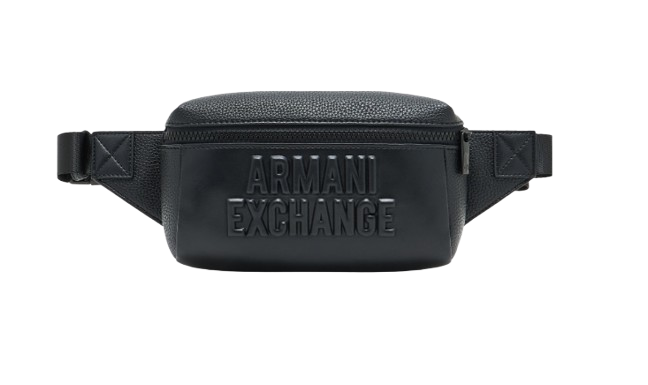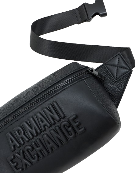 Marsupio uomo Armani Exchange. Modello: marsupio con logo frontale in rilievo 3D, finitura granulata sulla parte superiore, cinturino regolabile con fiabbia a scatto. Dimensioni: profondità 4,5cm, altezza 13cm, larghezza alla base 35cm. Composizione: 100% poliestere. Colore: nero.