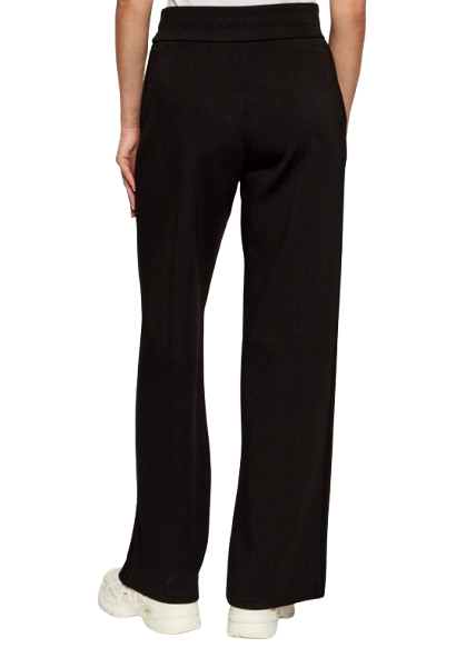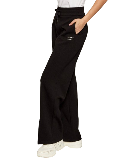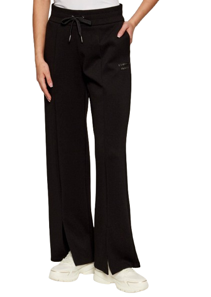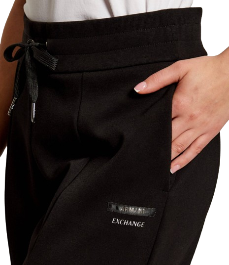 Pantaloni donna Armani Exchange. Modello: pantaloni sportivi, con elastico e coulisse in vita, spacco sull'orlo e logo sotto la tasca. Composizione: 56% poliamide, 8% elastane, 36% viscosa. Colore: nero.