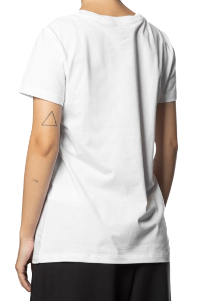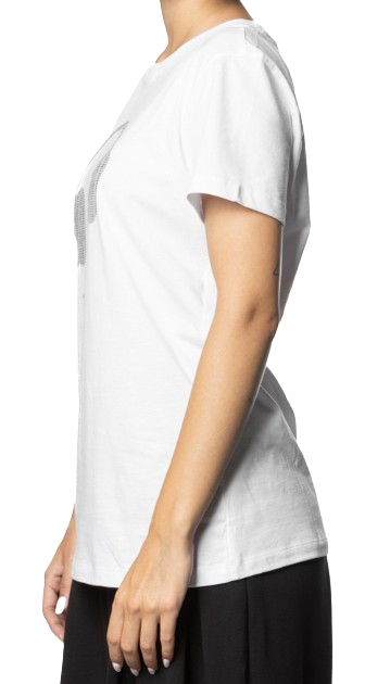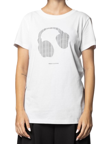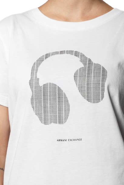 T-shirt donna Armani Exchange. Modello: t-shirt girocollo a maniche corte, con motivo sul petto. Composizione: 100% cotone. Colore: bianco.
