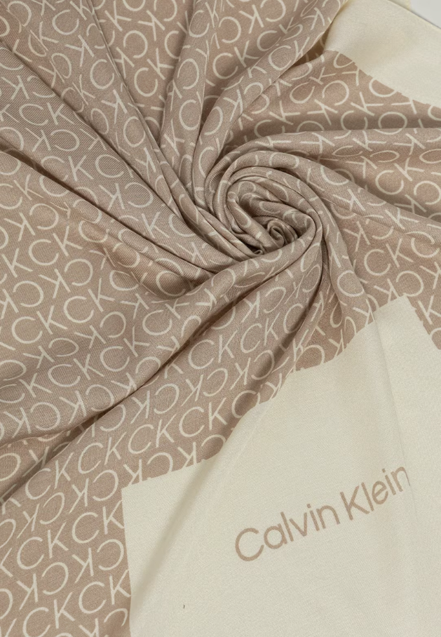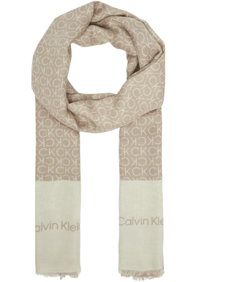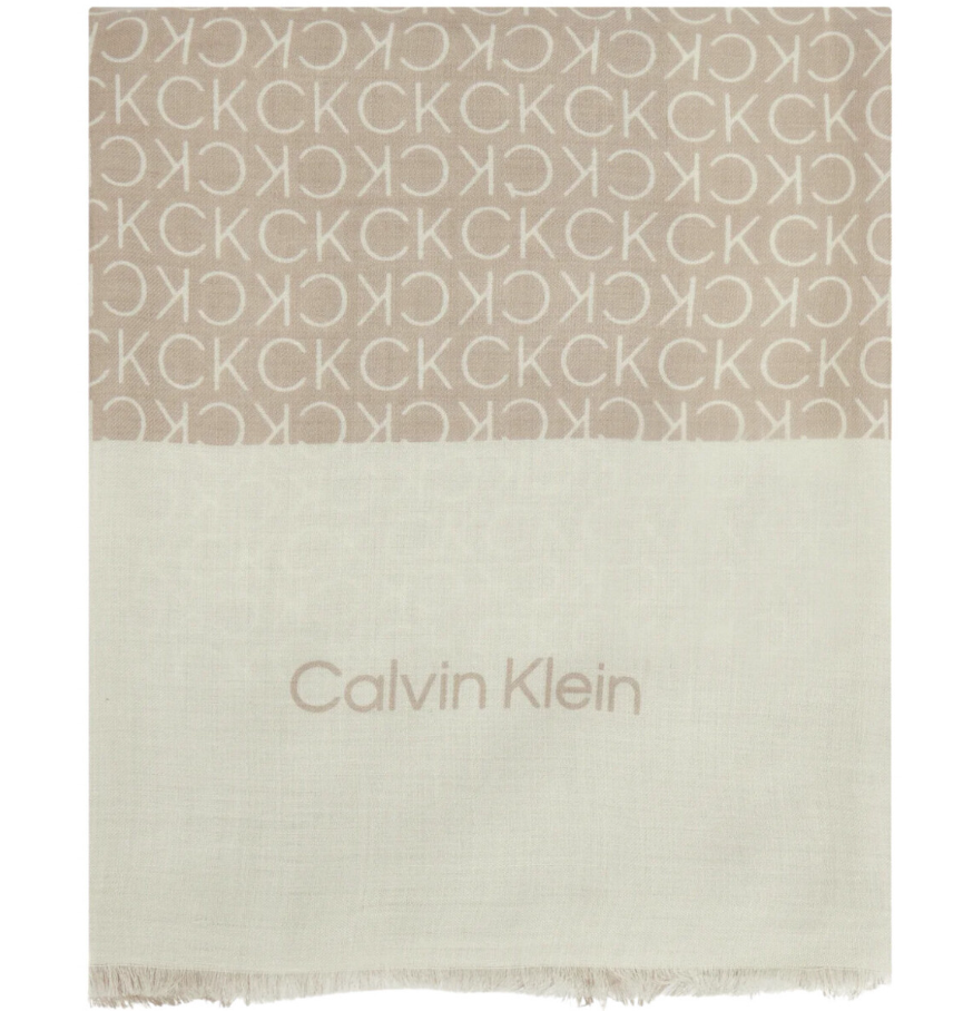 Sciarpa donna Calvin Klein. Modello: scialle Aop Minimal Logo. Dimensioni: 180 x 70 cm. Composizione: 51% modal, 49% viscosa. Colore: beige/bianco.