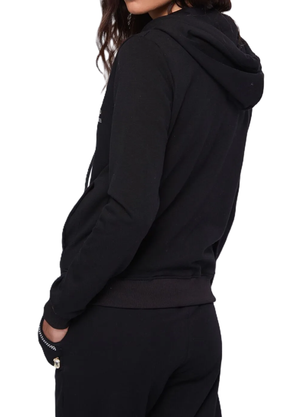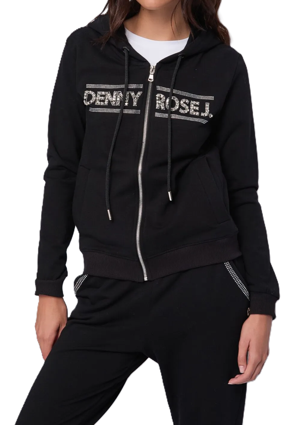 Felpa donna Denny Rose Modello: felpa con cappuccio e zip, logo con strass Materiale: 95% Cotone, 5% Elastan Colore: nero