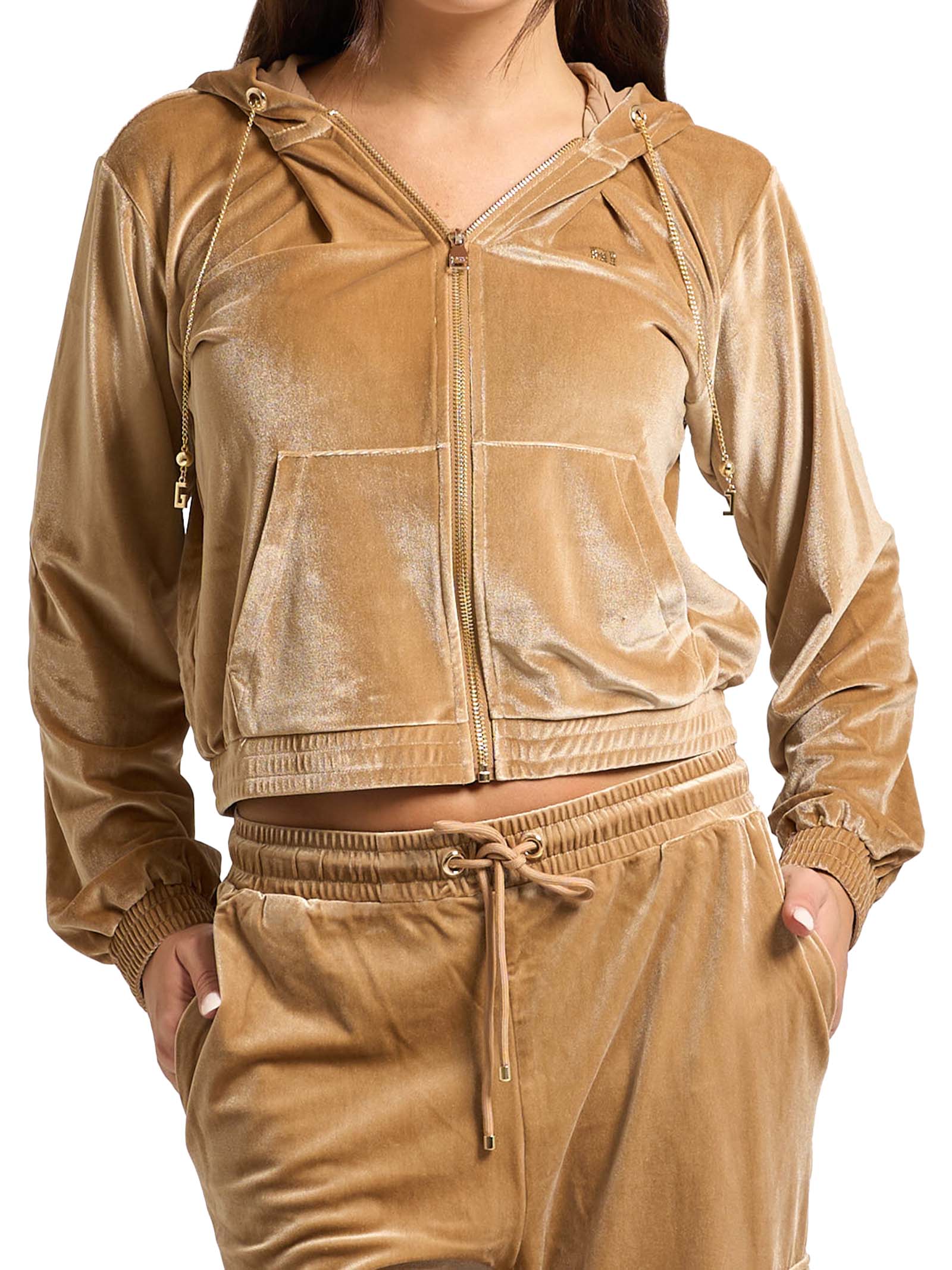 Felpa donna GaudìModello: con cappuccio e zipMateriale: 95% poliestere, 5% elastaneColore: marrone