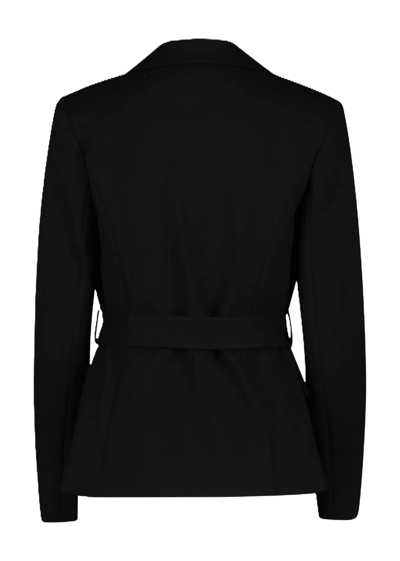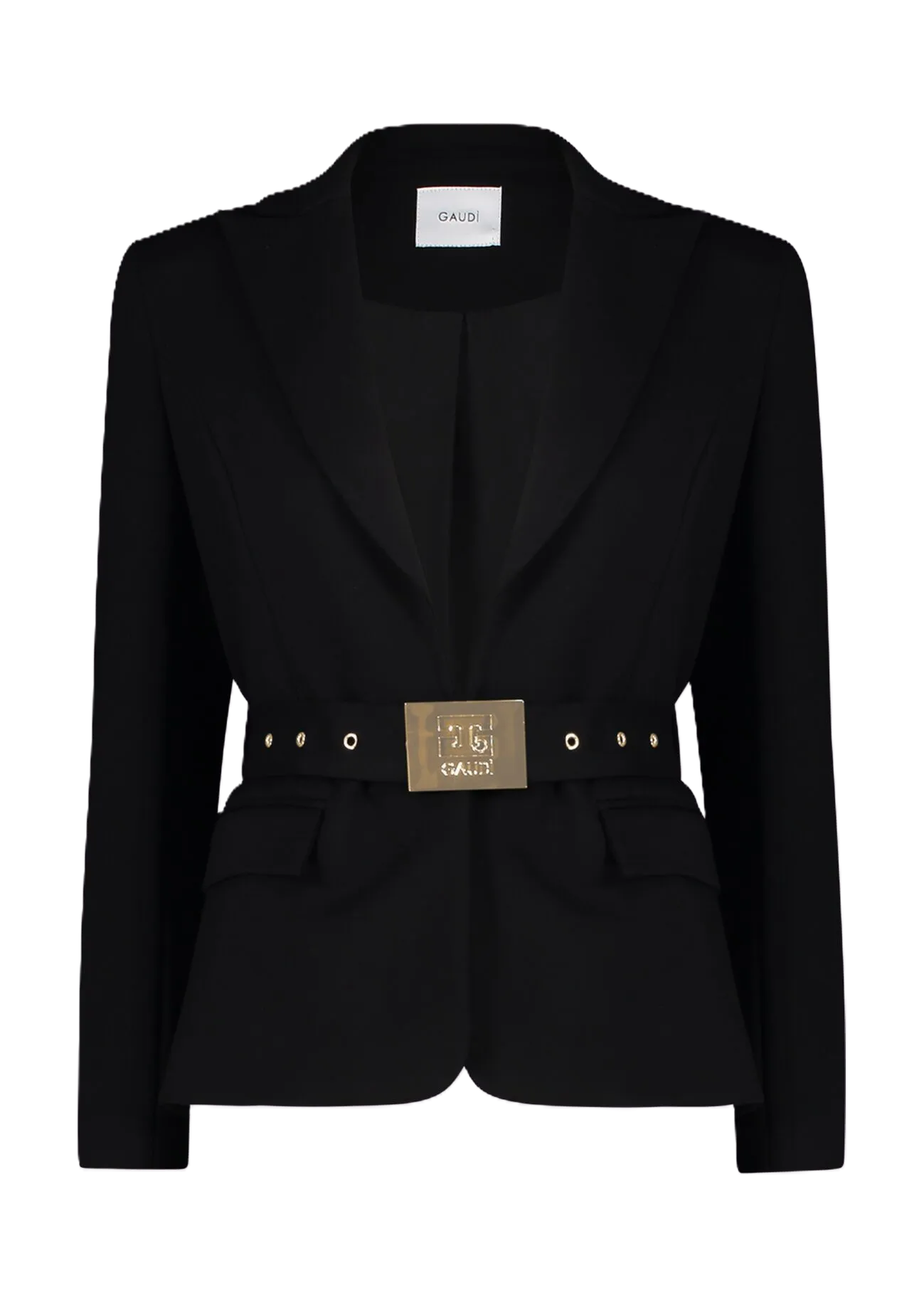 Giacca donna Gaudì Modello: blazer in misto viscosa elasticizzata con revers a lancia e cintura con fibbia logata dorata Materiale: 67% Viscosa (Lurex), 26% Poliammide, 7% Elastan Colore: nero
