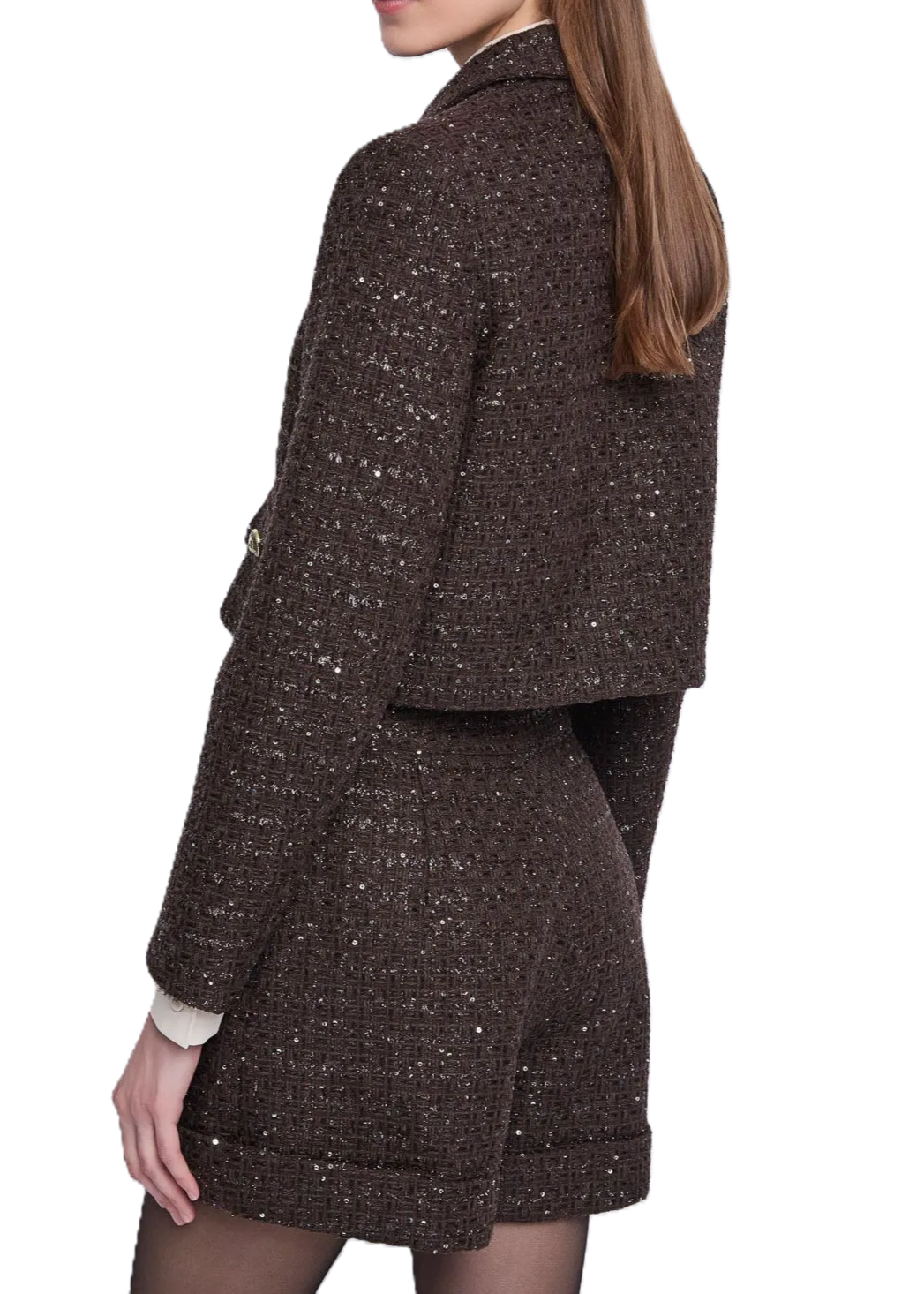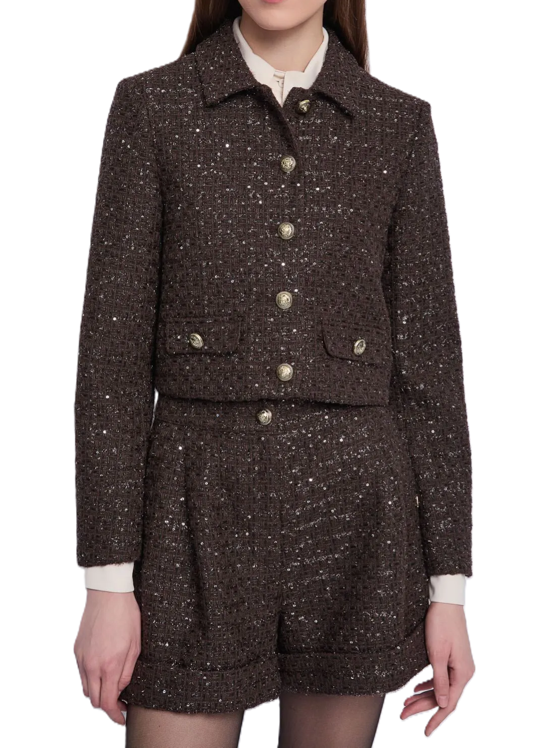 Giacca donna Gaudì Modello: giacca in bouclé di misto lana e lurex con paillettes e bottoni dorati Materiale: 70% Poliestere, 20% Lana, 10% Fibra Metallica Colore: marrone