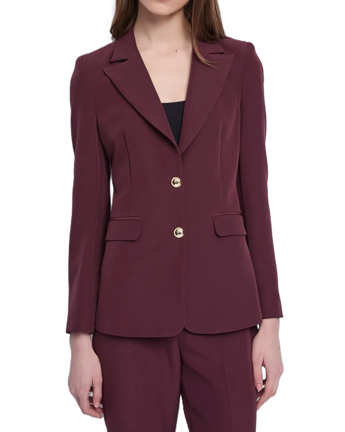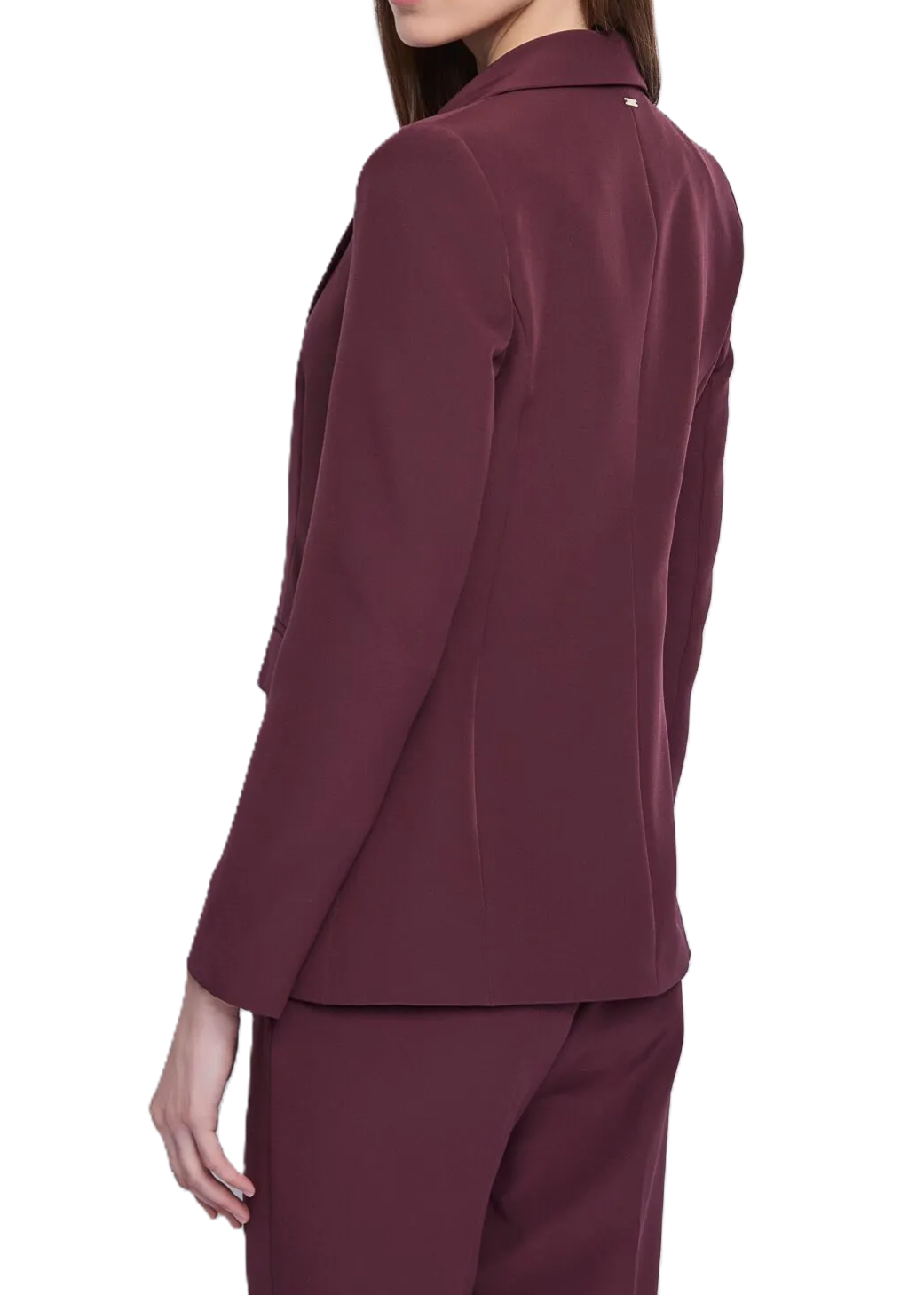 Giacca donna Gaudì Modello: blazer in tessuto tecnico elasticizzato con revers a lancia e bottoni dorati Materiale: 88% Poliestere, 12% Elastan Colore: vinaccio