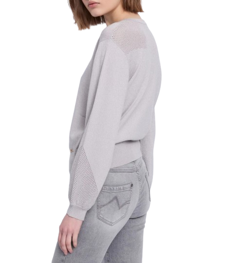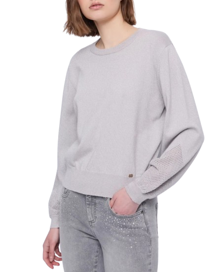 Maglia donna Gaudì. Modello: maglia in filato lurex con lavorazione punzonata e logo GJ in metallo. Composizione: 42% poliestere, 40% viscosa (lurex), 18% poliammide. Colore: grigio.