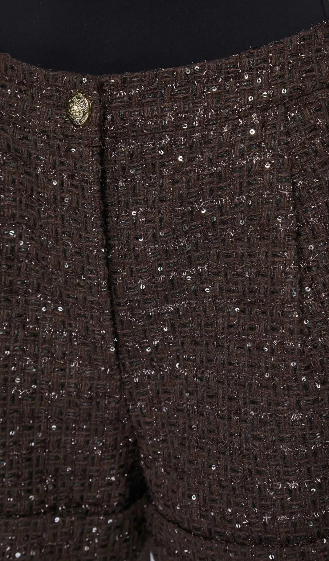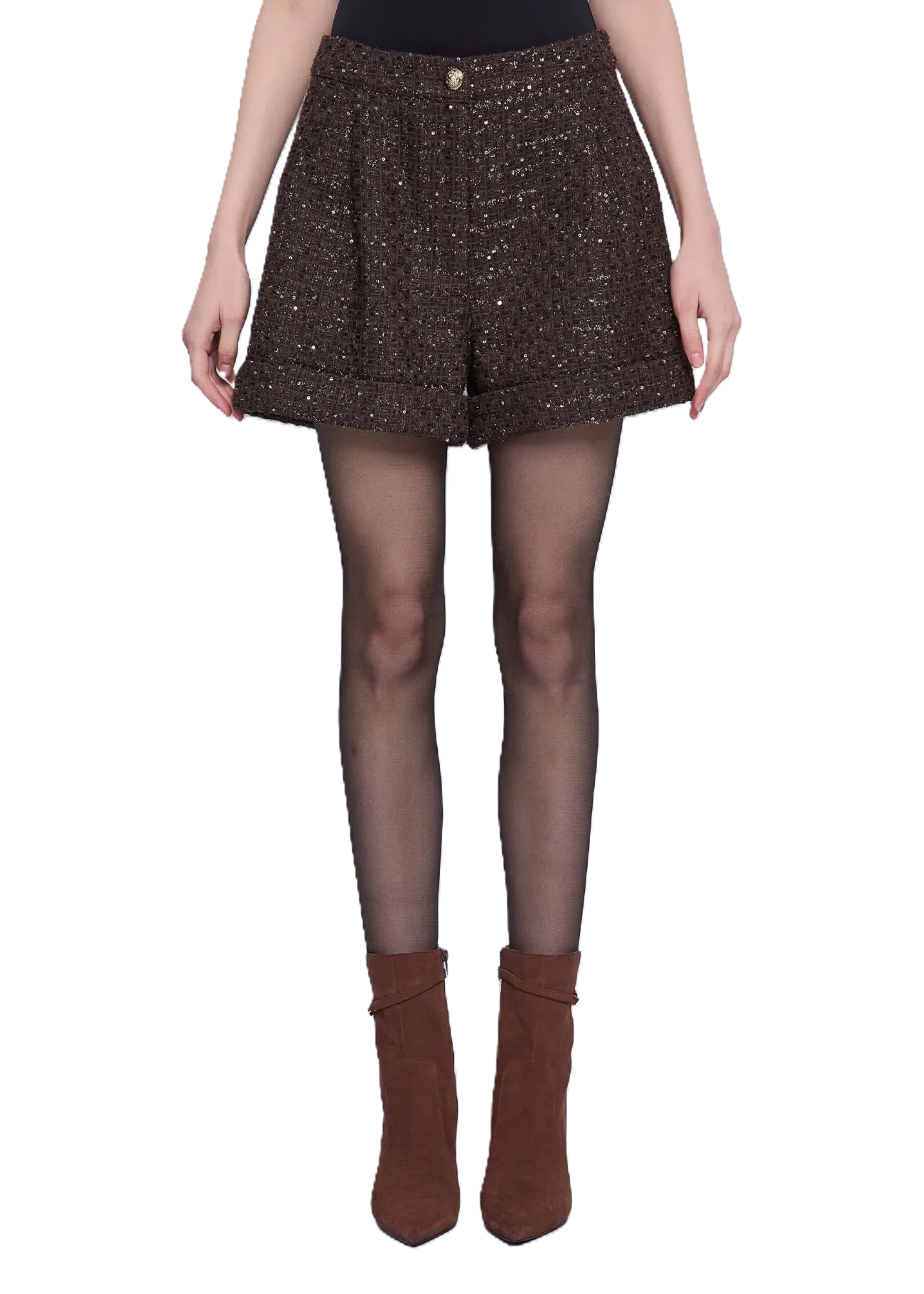Shorts donna Gaudì Modello: shorts in bouclè di misto lana e lurex con mini paillettes, pinces e bottone gioiello Materiale: 70% Poliestere, 20% Lana, 10% Fibra Metallica Colore: marrone