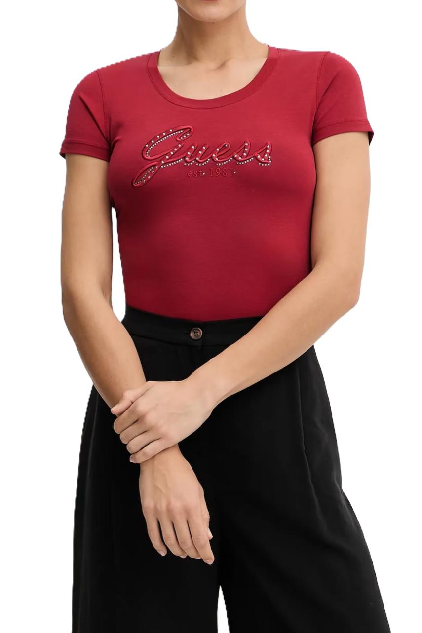 T-shirt donna Guess Modello: girocollo Materiale: 95% Cotone, 5% Elastan Colore: granata