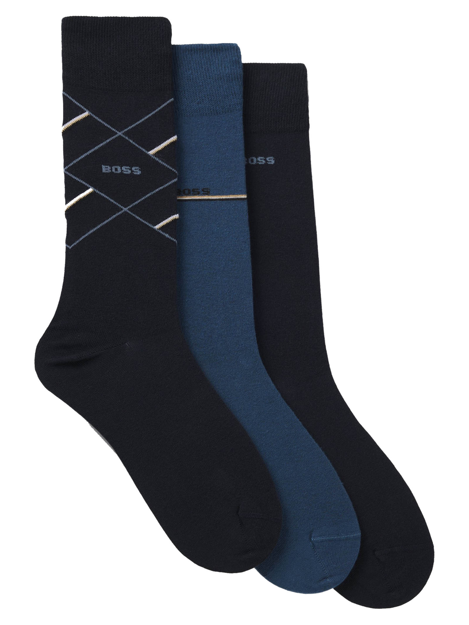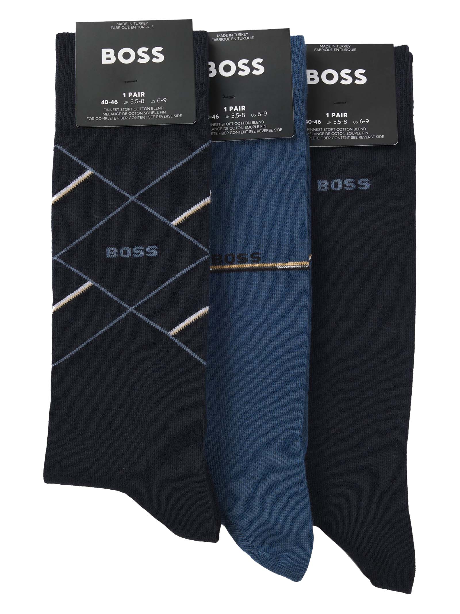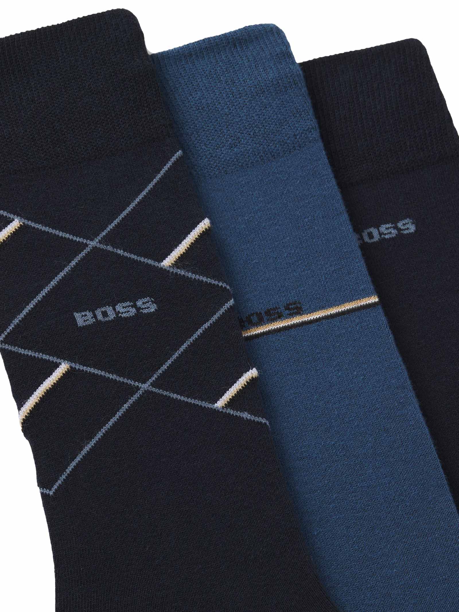 Set Calze uomo Hugo Boss Modello: 3 paia di calzini Materiale: 72% Cotone, 23% Poliestere, 3% Poliammide, 2% Elastan Colore: blu