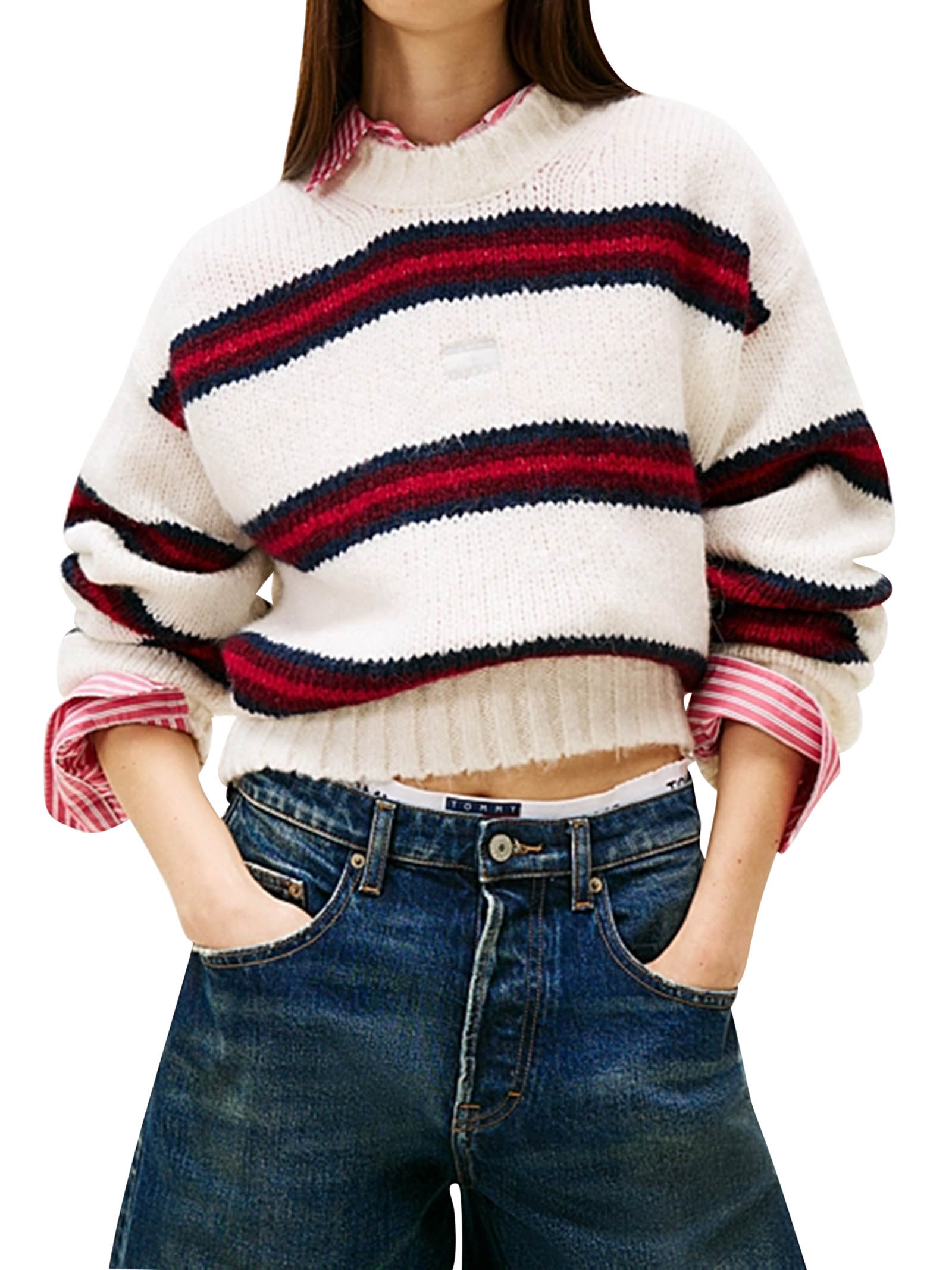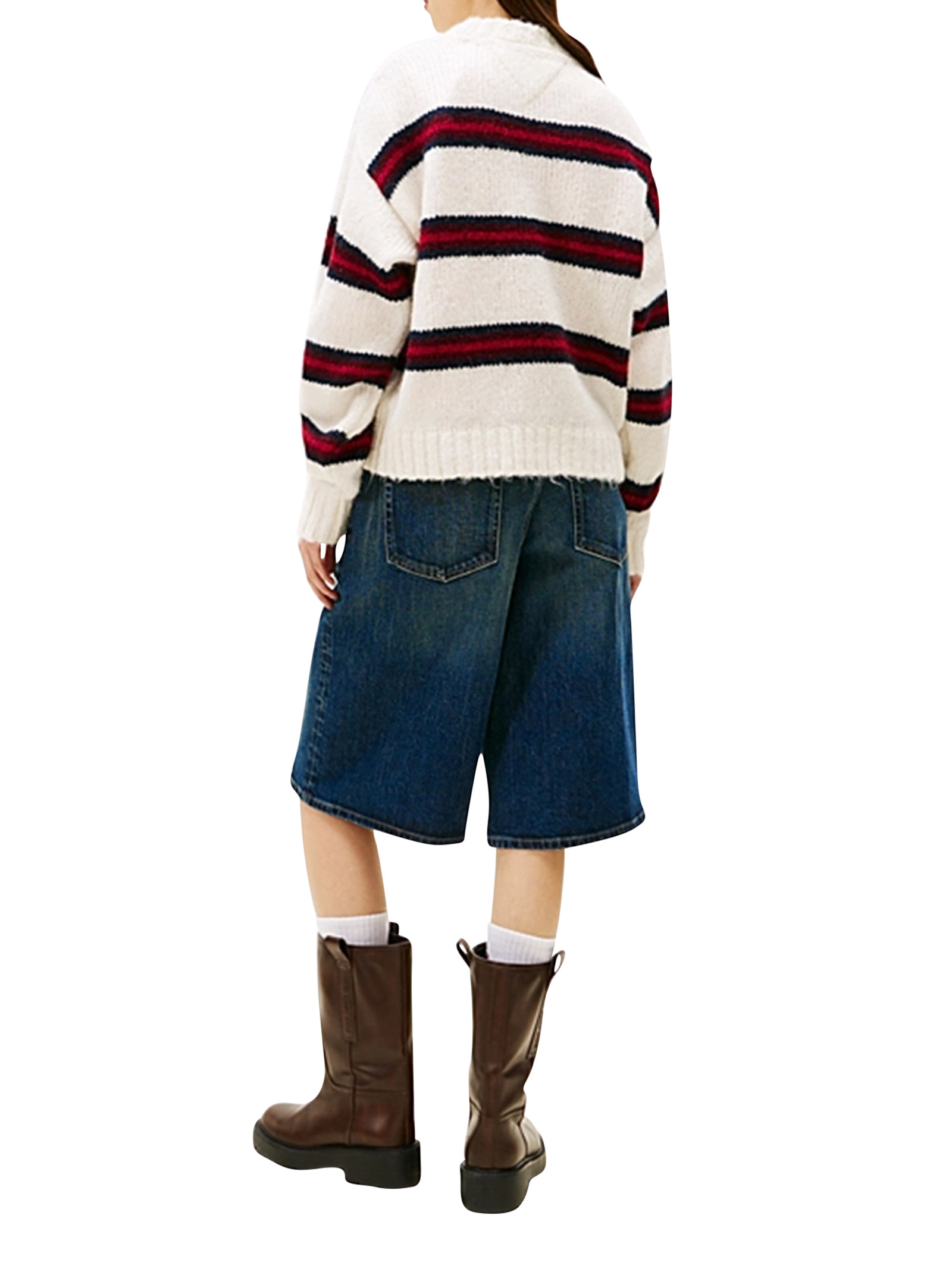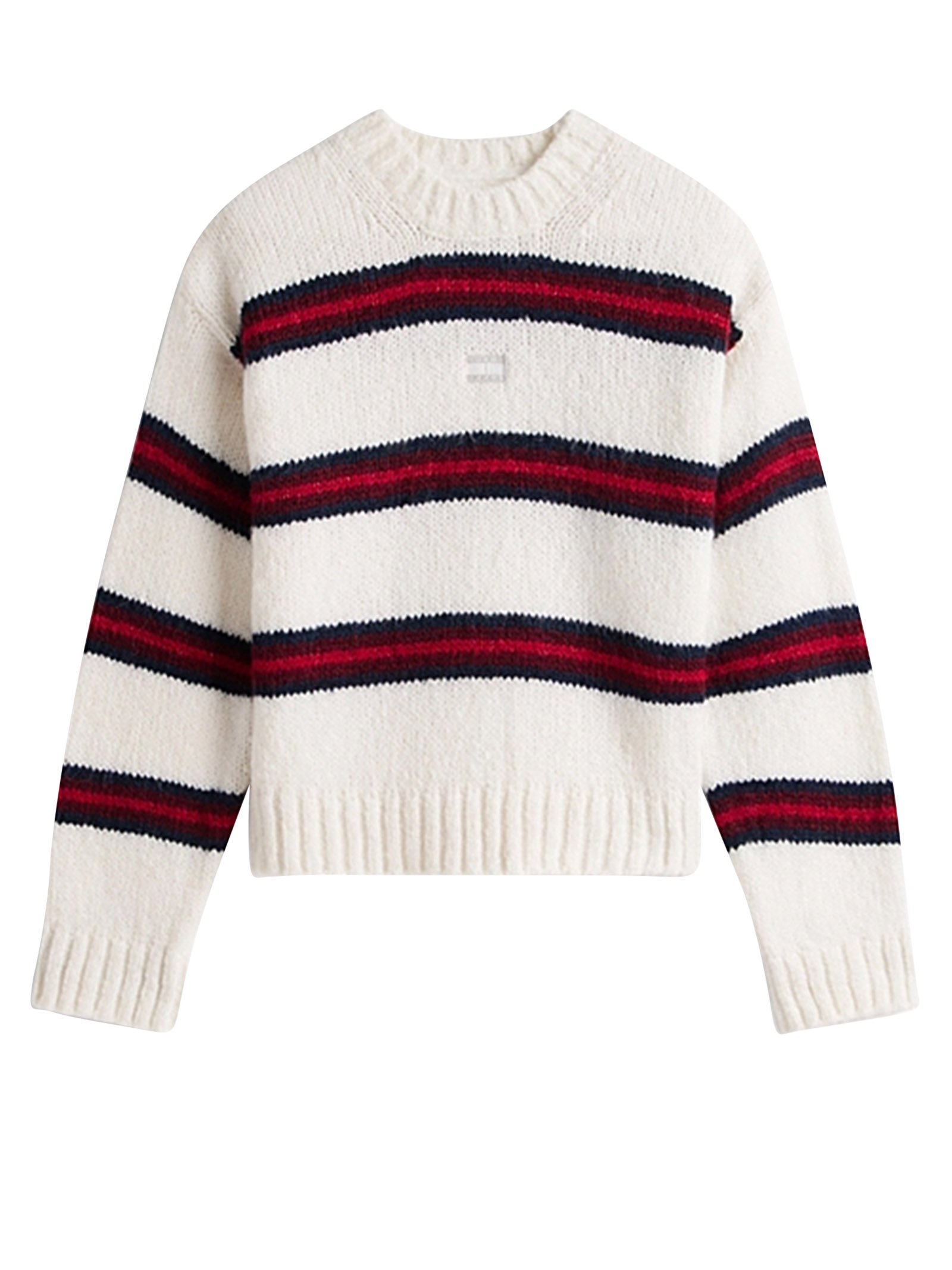 Pullover donna Tommy HilfigerModello: girocolloMateriale: 69% acrilico, 23% poliestere, 8% alpacaColore: bianco